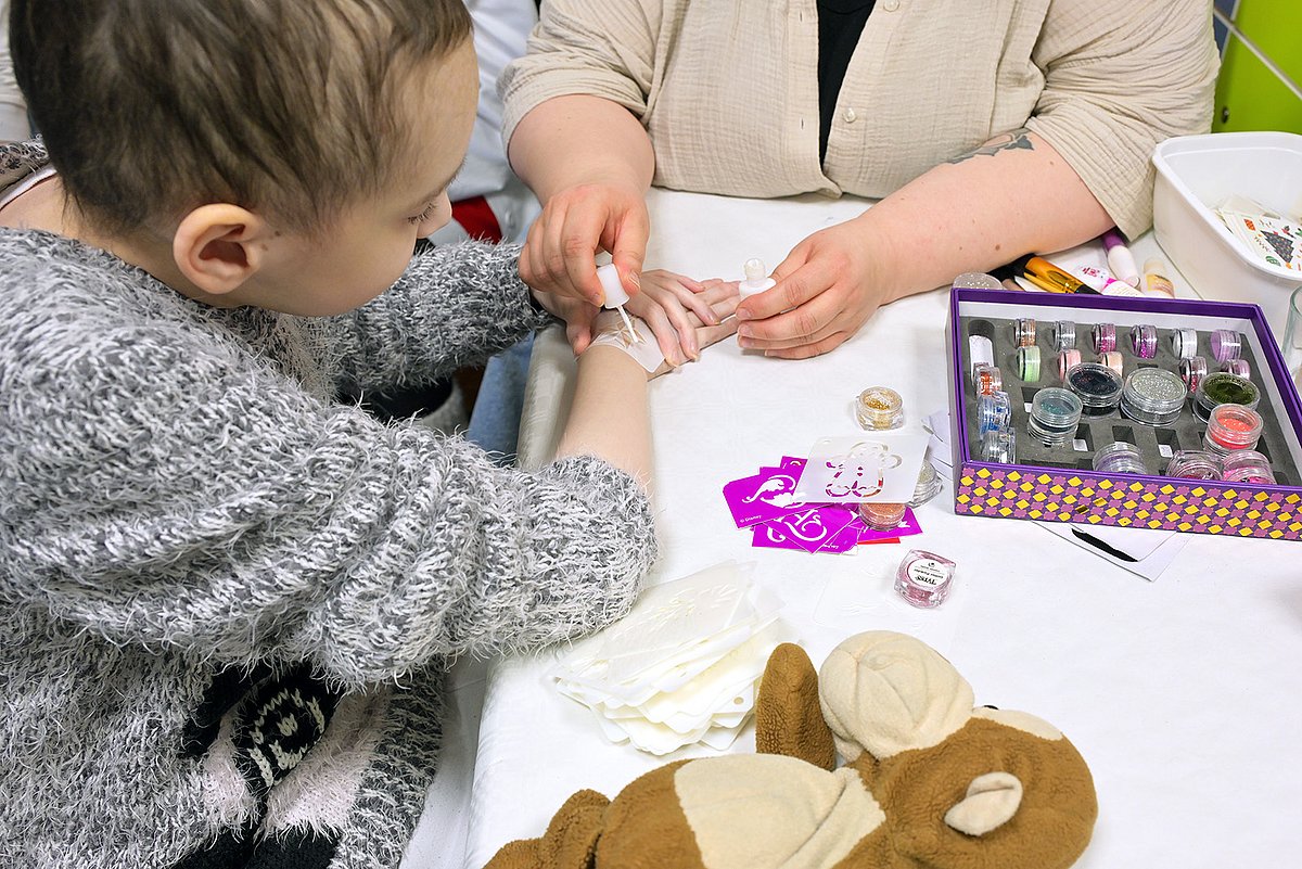 Es glitzerte und funkelte auf dem Handrücken einer jugendlichen Patientin. Mit viel Hingabe zauberte ihr das Stationsteam Glitzertattoos in Schmetterlings- und Sternform auf die Haut. Andere Kinder nutzten die Gelegenheit, um sich mit verschiedenen weihnachtlichen Accessoires vor der Linse der Fotobox in Szene zu setzen und gemeinsam zu lachen. Außerdem gab es ein buntes Bastelangebot: Die Kinder und Jugendlichen konnten zum Beispiel kleine Schraubgläser festlich dekorieren. Wer Hunger und Durst hatte, konnte sich mit selbst gebackenen Waffeln und Kinderpunsch stärken.