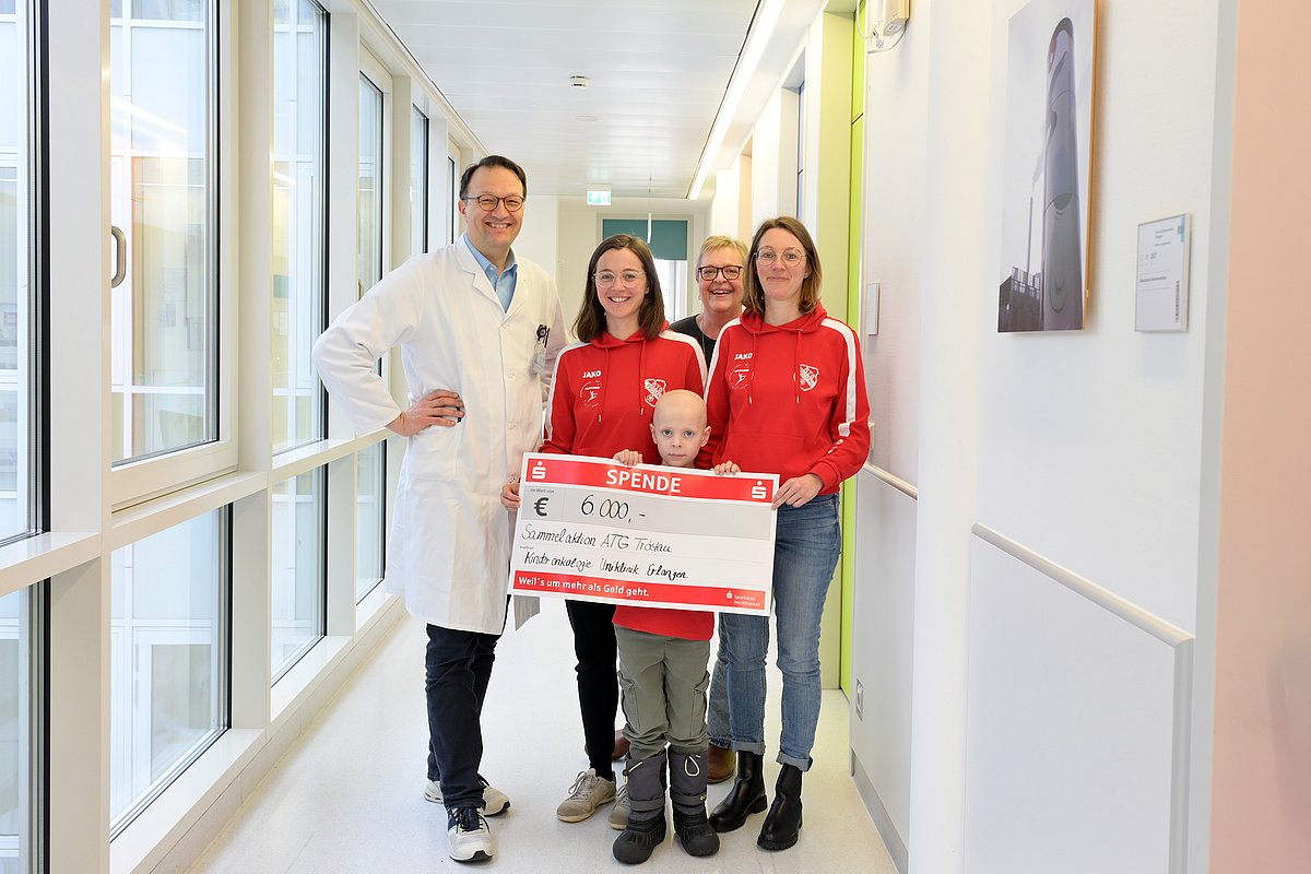Balancieren, Klettern, spielerische Bewegung – das steht beim Kinderturnen des ATG Tröstau e. V. eigentlich im Mittelpunkt. Doch vor neun Monaten erkrankte der damals vierjährige Friedrich, ein Mitglied der Turngruppe, an Krebs. Für die Trainerinnen Theresa Rogler und Miriam Wunderlich war sofort klar: „Wir möchten zeigen, dass wir an die Familie denken. Und dass Friedrich weiterhin ein Teil vom Kinderturnen ist, auch wenn er aktuell nicht mitmachen kann.“ Deshalb sollte die Hälfte des Erlöses vom Weihnachtsturnen an die Kinderonkologie der Kinder- und Jugendklinik des Uniklinikums Erlangen gehen, wo der Junge aktuell in Behandlung ist. Gemeinsam mit dem Vorstand des ATG Tröstau e. V. reifte schließlich der Entschluss die Hilfsaktion fortzuführen: Der Verein startete eine GoFundMe-Kampagne, über die insgesamt 6.000 Euro gesammelt wurden. „Wir waren überwältigt von der Resonanz und der Hilfsbereitschaft – ein herzliches Dankeschön an alle Spenderinnen und Spender“, betonte Theresa Rogler. Die Trainerinnen übergaben nun den symbolischen Spendenscheck an Prof. Dr. Markus Metzler, Leiter der Kinderonkologie – und zwar gemeinsam mit dem kleinen Friedrich, der für seine letzte Chemotherapie vor Ort war.